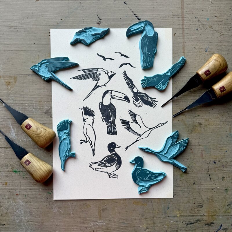 Timbro in linoleum realizzati a mano con gomma naturale. Stampa su tessuto legno vetro carta.